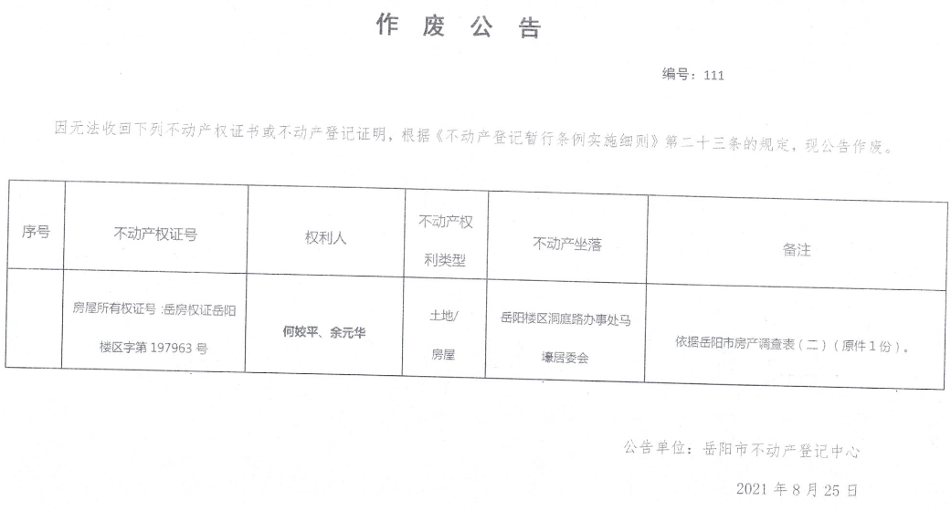 作废公告 编号111(何姣平、余元华)