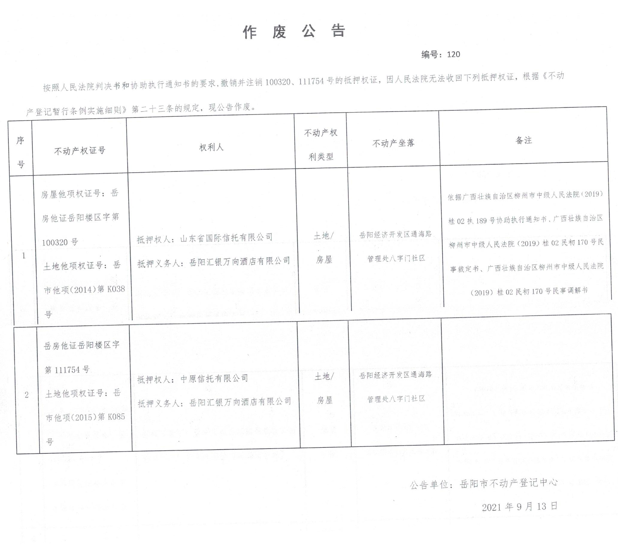 作废公告 编号:120(抵押权人山东省国际信托有限公司、中原信托有限公司;抵押义务人岳阳汇银万向酒店有限公司)11