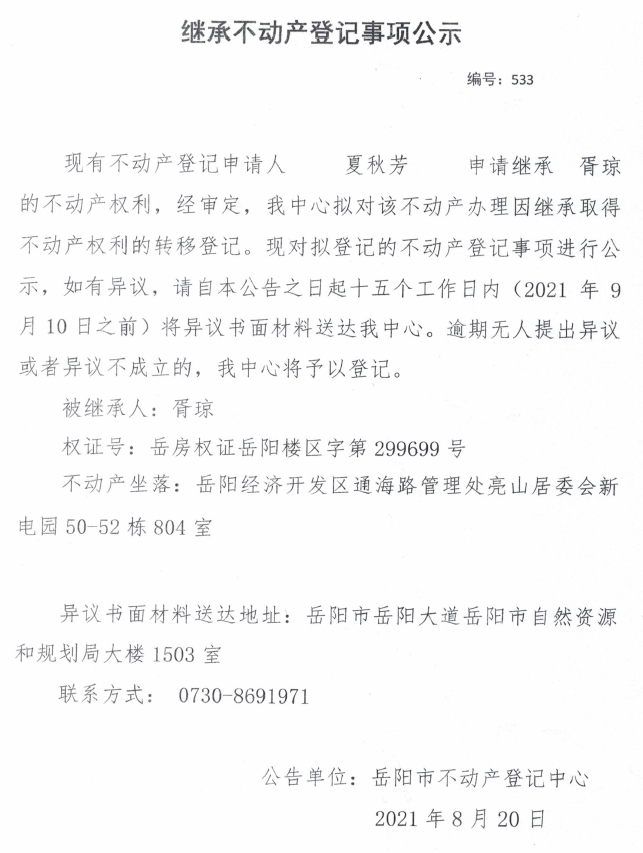 继承不动产登记公示 编号:(2021)继533(夏秋芳)