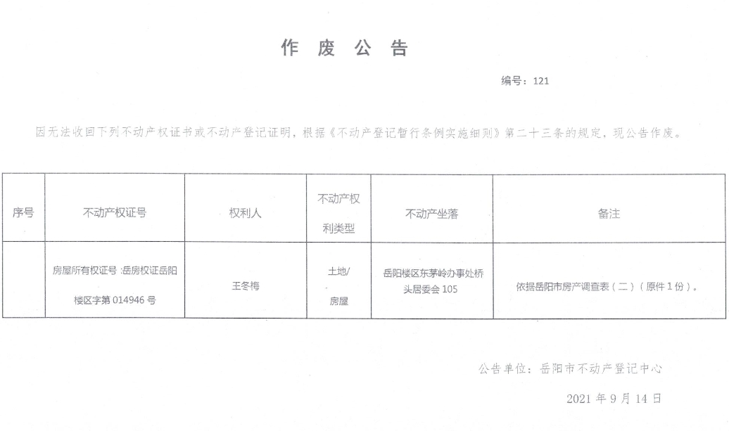 作废公告 编号121(王冬梅)