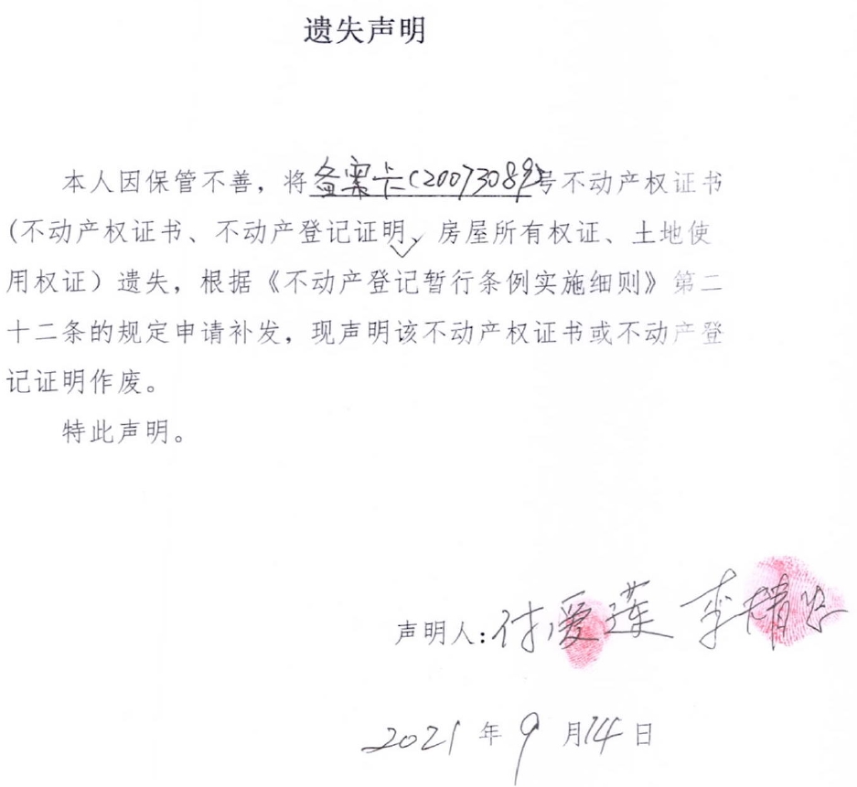 遗失声明(李精忠、付爱连)