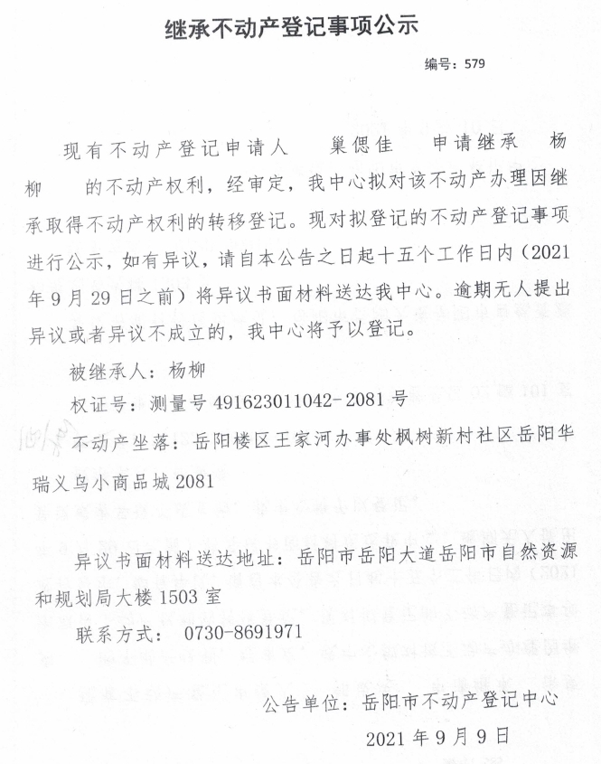 继承不动产登记公示 编号:(2021)继579(巢偲佳)