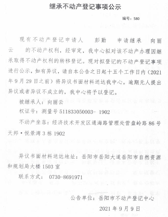 继承不动产登记公示 编号:(2021)继580(彭勤)
