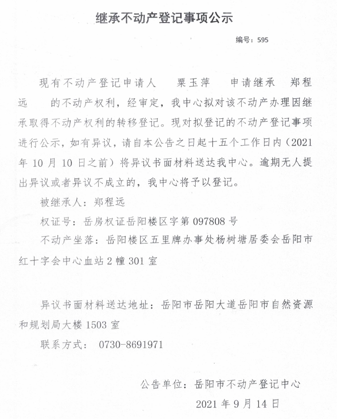 继承不动产登记公示 编号:(2021)继595(粟玉萍)