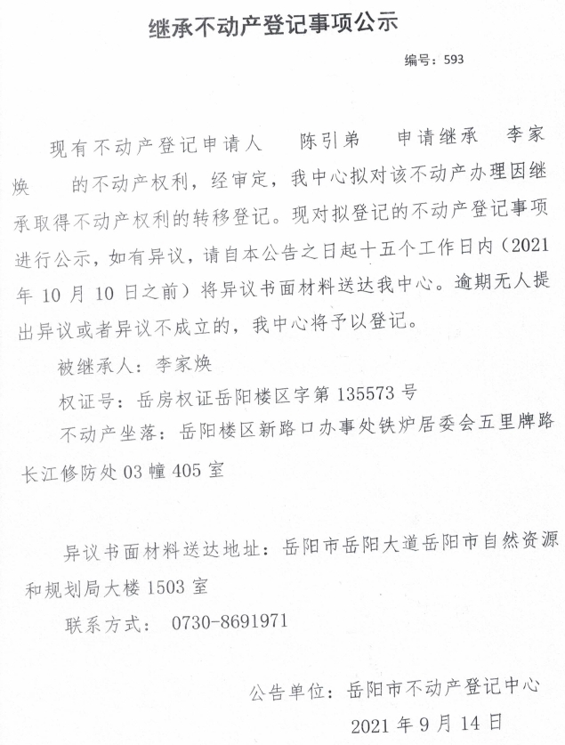 继承不动产登记公示 编号:(2021)继593(陈引弟)
