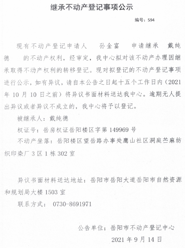 继承不动产登记公示 编号:(2021)继594(孙金富)