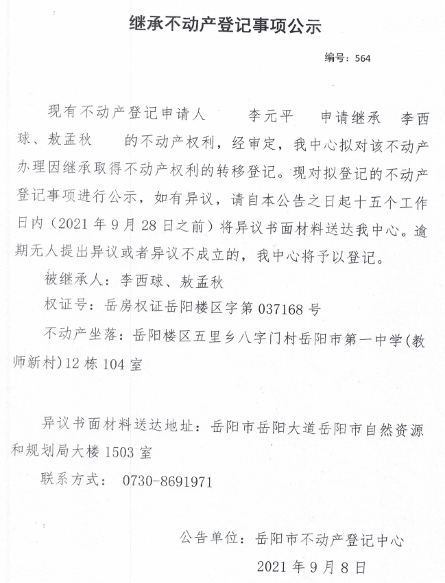 继承不动产登记公示 编号:(2021)继564(李元平)
