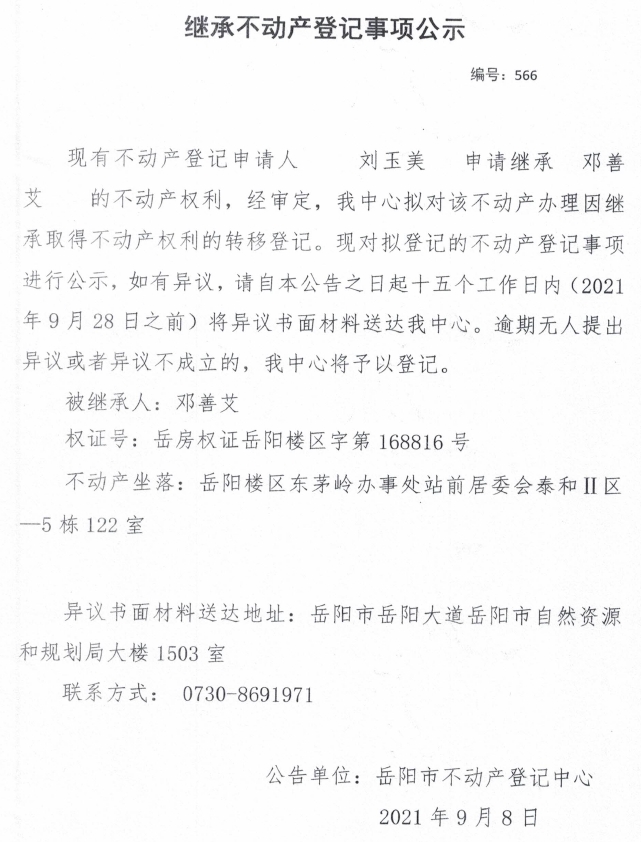继承不动产登记公示 编号:(2021)继566(刘玉美)