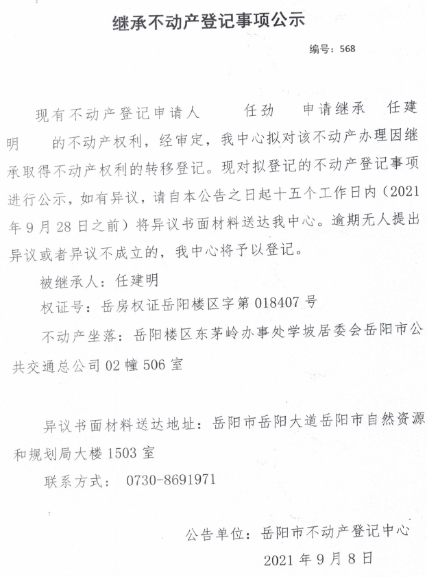继承不动产登记公示 编号:(2021)继568(任劲)