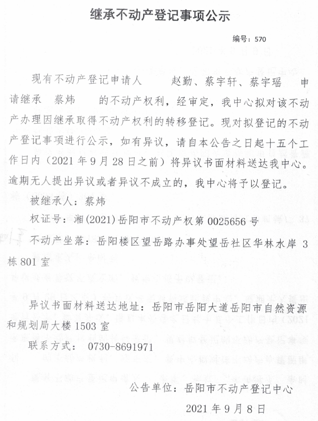 继承不动产登记公示 编号:(2021)继570(赵勤)