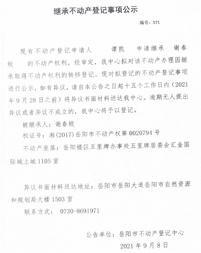 继承不动产登记公示 编号:(2021)继571(谭凯)
