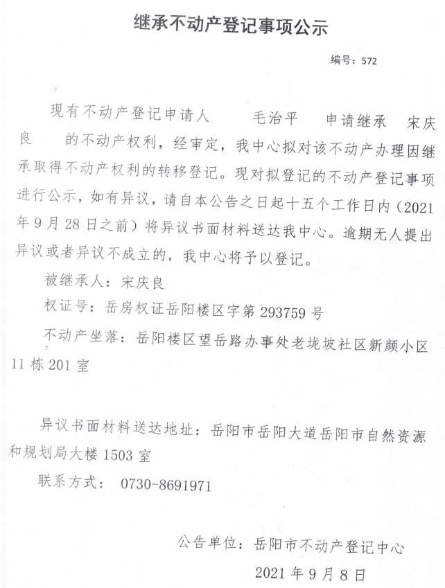 继承不动产登记公示 编号:(2021)继572(毛治平)