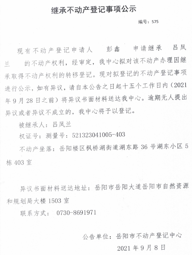继承不动产登记公示 编号:(2021)继575(彭鑫)