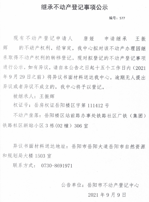 继承不动产登记公示 编号:(2021)继577(唐娅)