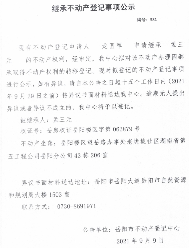 继承不动产登记公示 编号:(2021)继581(龙国军)