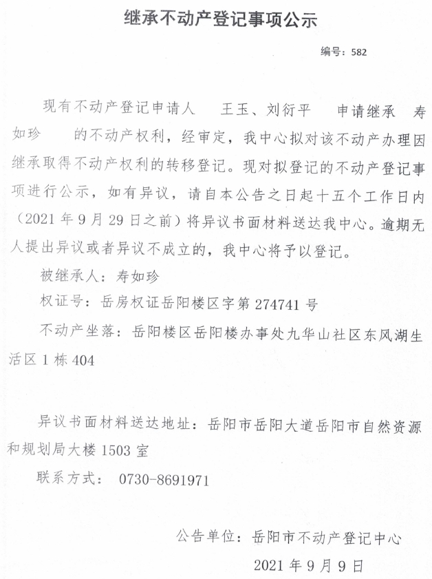 继承不动产登记公示 编号:(2021)继582(王玉)