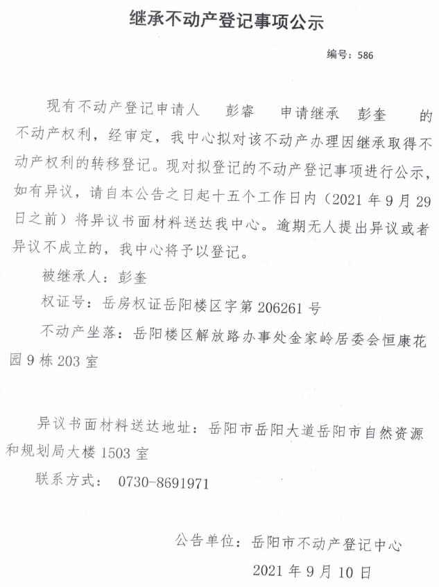 继承不动产登记公示 编号:(2021)继586(彭睿)