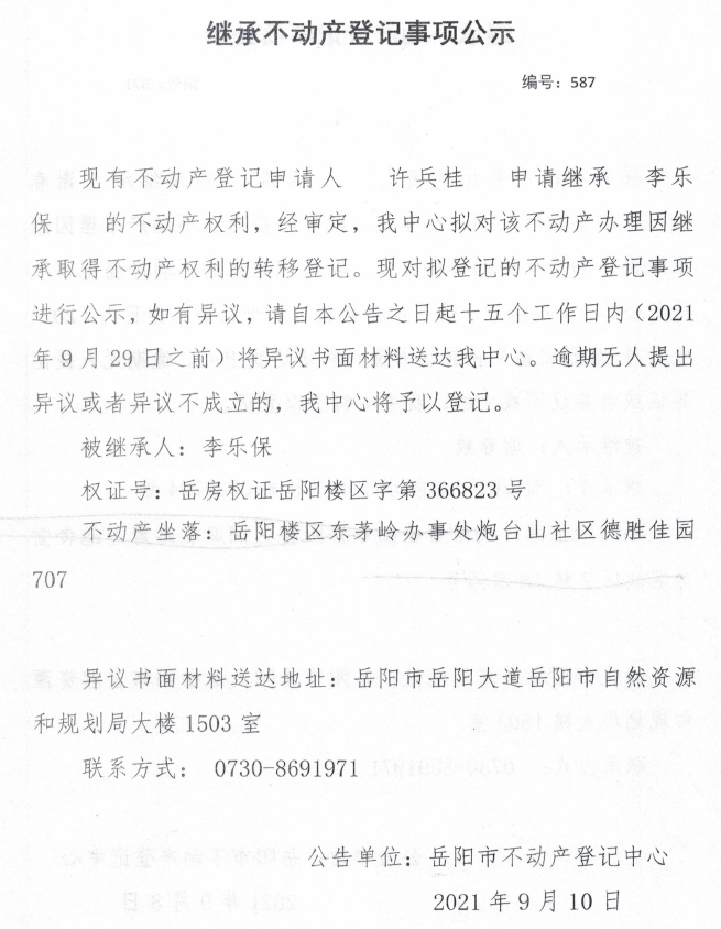 继承不动产登记公示 编号:(2021)继587(许兵桂)