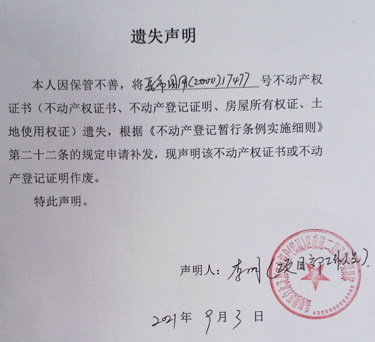 遗失声明(岳阳楼区白水及磨子山棚户(旧城)改造二期吕仙停项目部申请秦明义土地证遗失)