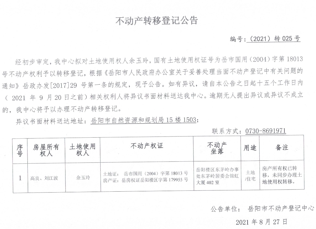 不动产转移登记公告 编号:025号(余玉玲)