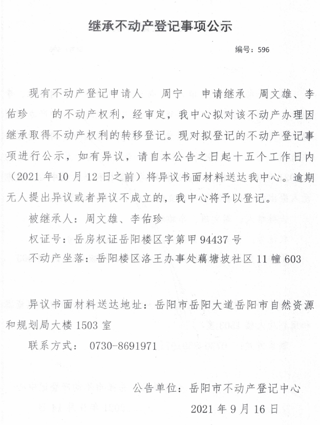 继承不动产登记公示 编号:(2021)继596(周宁)