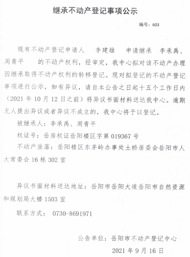 继承不动产登记公示 编号:(2021)继603(李建雄)