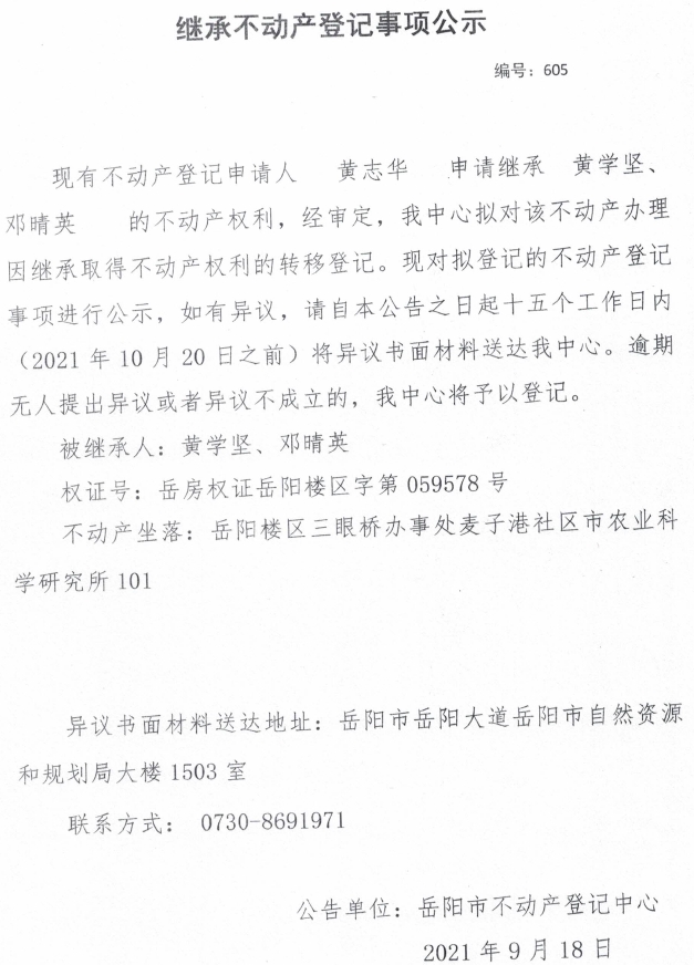 继承不动产登记公示 编号:(2021)继605(黄志华)