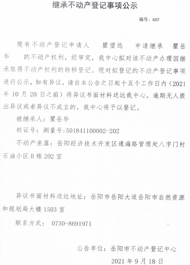 继承不动产登记公示 编号:(2021)继607(瞿望远)