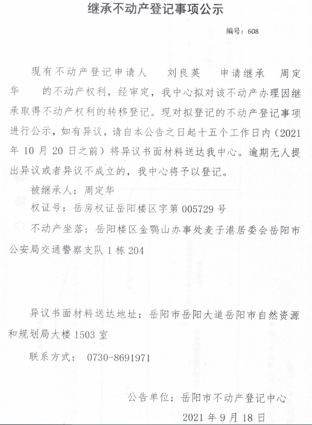 继承不动产登记公示 编号:(2021)继608(刘良英)