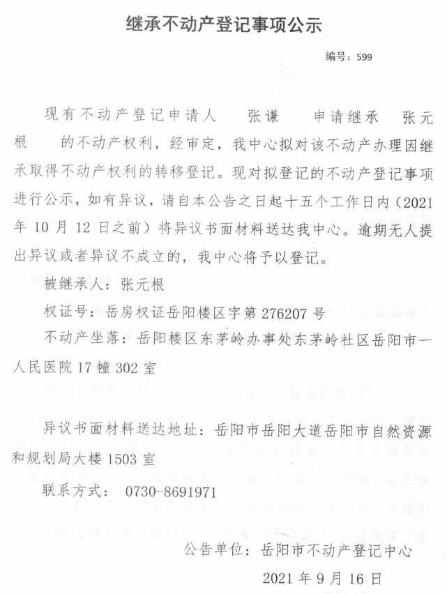 继承不动产登记公示 编号:(2021)继599(张谦)