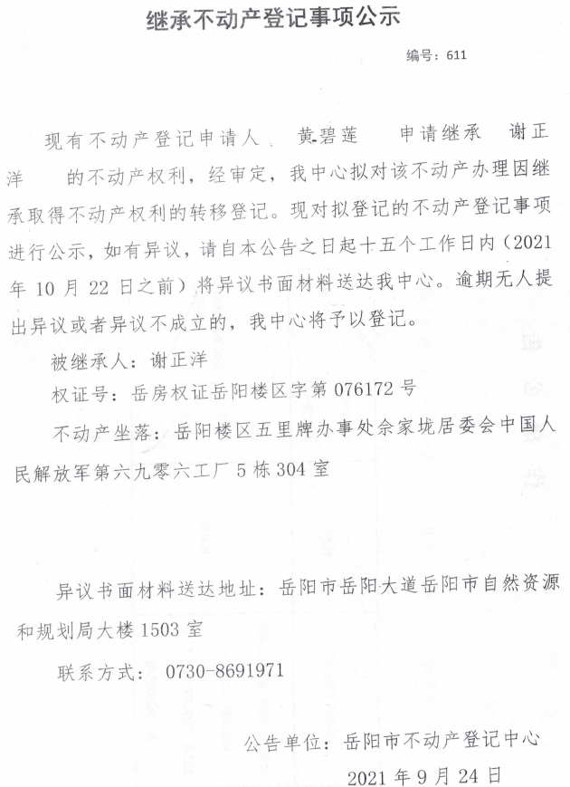 继承不动产登记公示 编号:(2021)继611(黄碧莲)