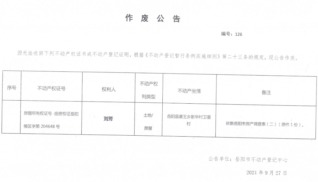作废公告 编号:126(刘芳)