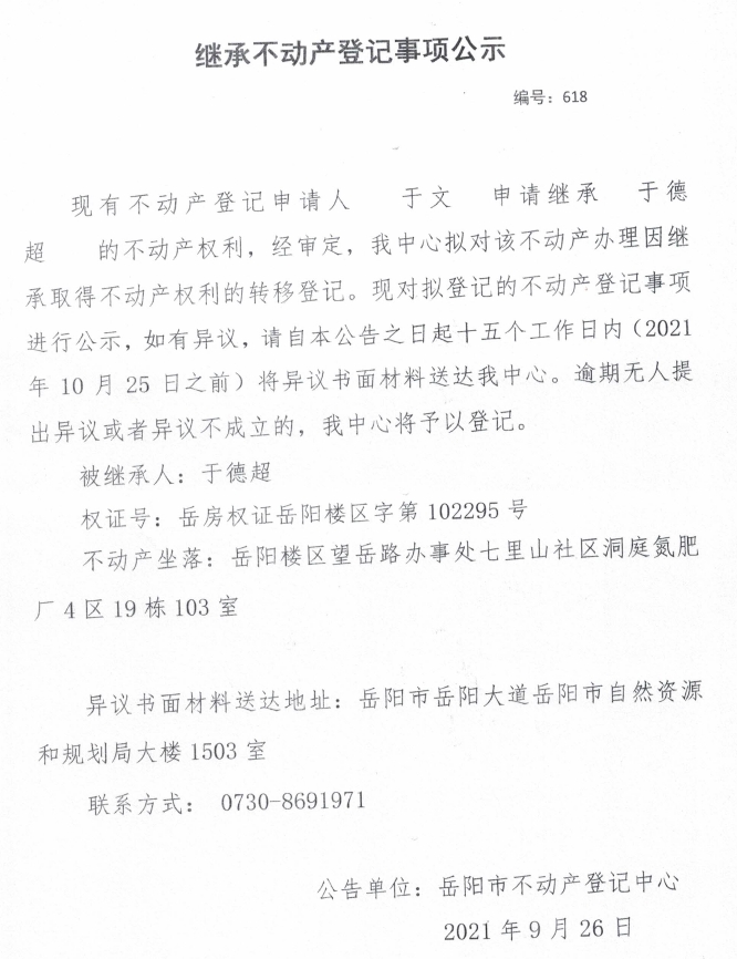 继承不动产登记公示 编号:(2020)继号618号(于文)