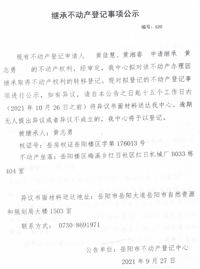 继承不动产登记公示 编号:(2020)继号620号(黄佳慧)