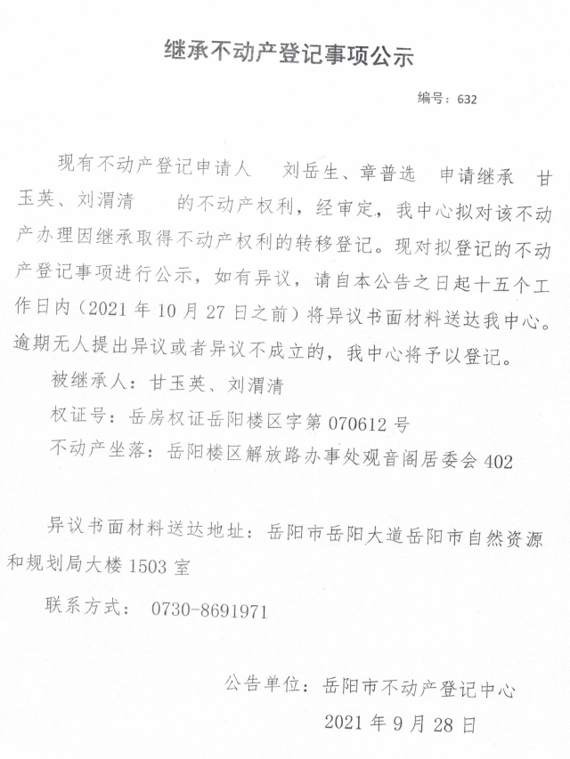 继承不动产登记公示 编号:(2020)继号632号(刘岳生)
