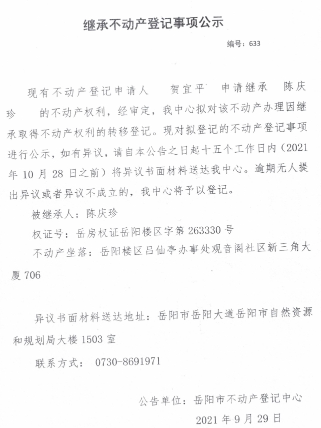 继承不动产登记公示 编号:(2020)继号633号(贺宜平)