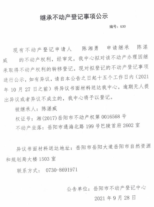 继承不动产登记公示 编号:(2021)继630号(陈湘勇)