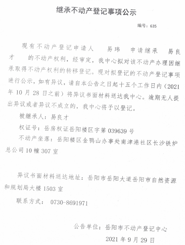 继承不动产登记公示 编号:(2021)继635号(易玮)