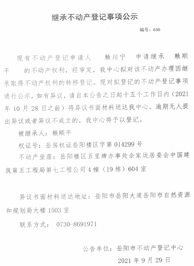 继承不动产登记公示 编号:(2021)继636号(赖川宁)