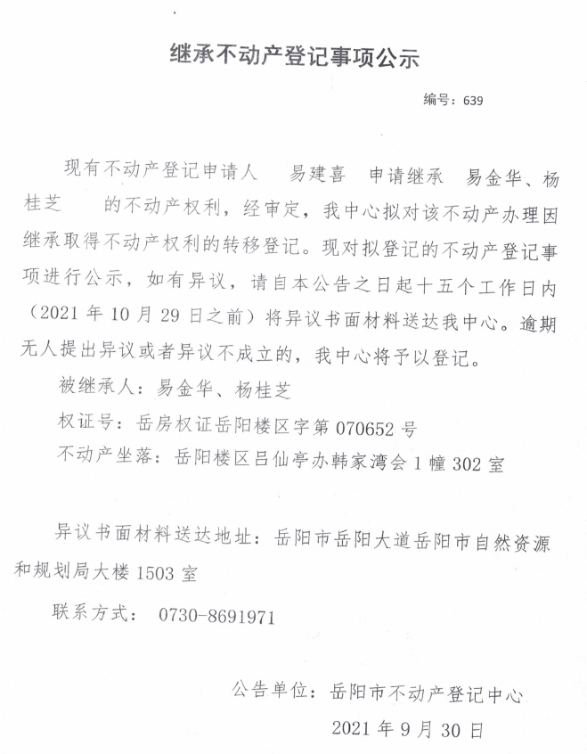继承不动产登记公示 编号:(2021)继639号(易建喜)