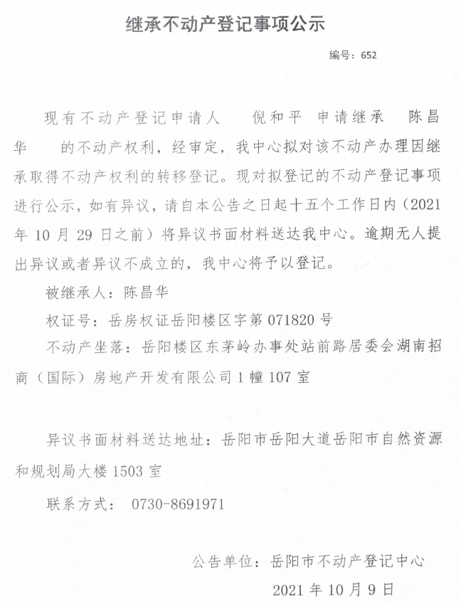 继承不动产登记公示 编号:(2021)继652号(倪和平)