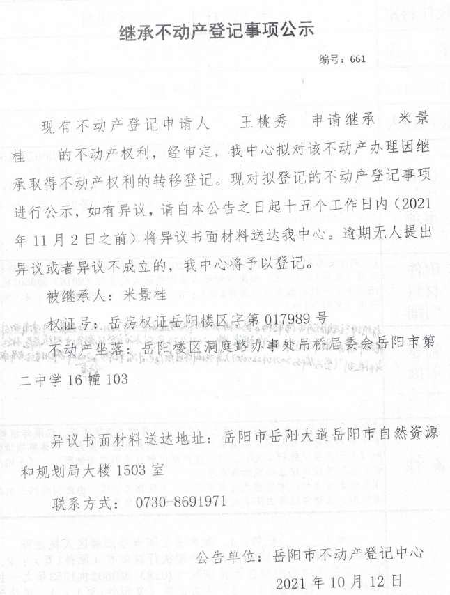 继承不动产登记公示 编号:(2021)继661号(王桃秀)