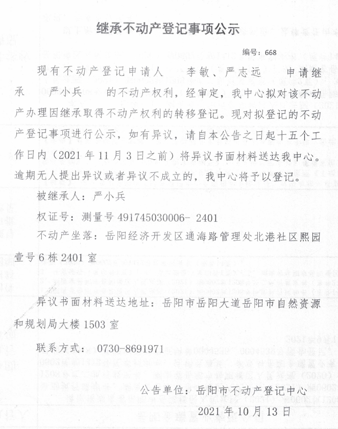 继承不动产登记公示 编号:(2021)继668号(李敏、严志远)