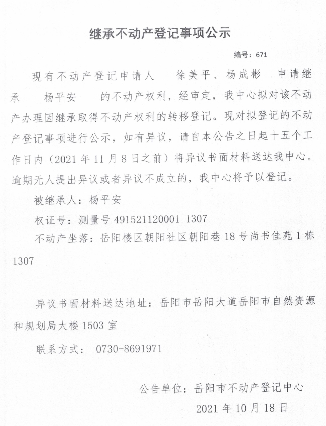 继承不动产登记公示 编号:(2021)继671号(徐美平)
