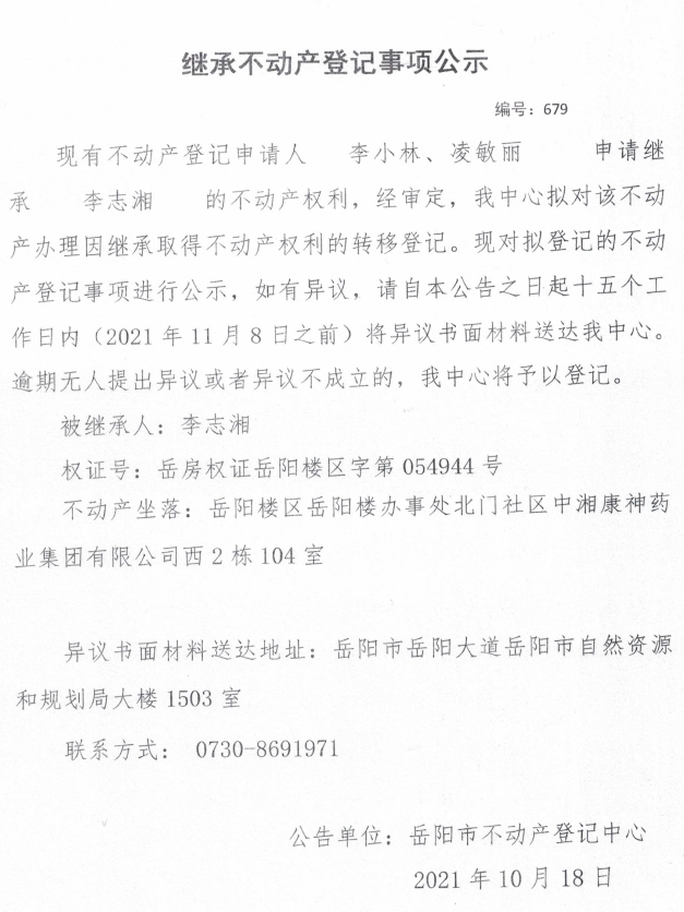 继承不动产登记公示 编号:(2021)继679号(李小林)