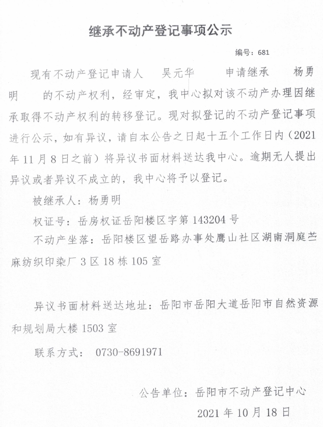 继承不动产登记公示 编号:(2021)继681号(吴元华)