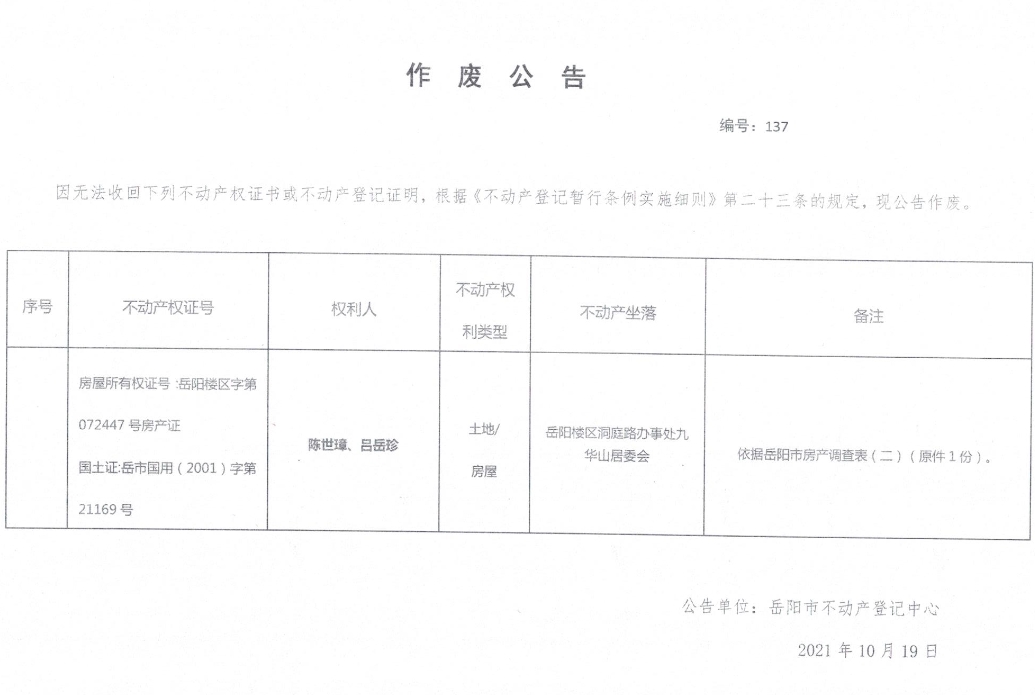 作废公告 编号:137( 陈世璋、吕岳珍)