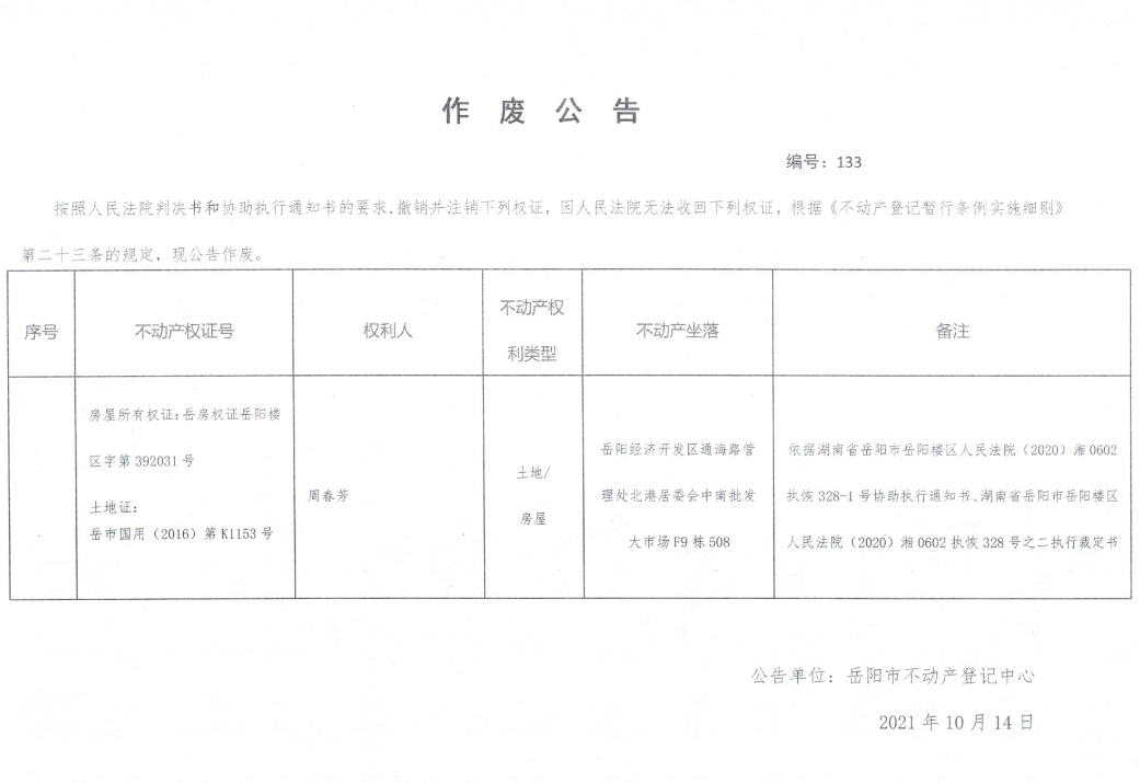 作废公告 编号133(周春芳)