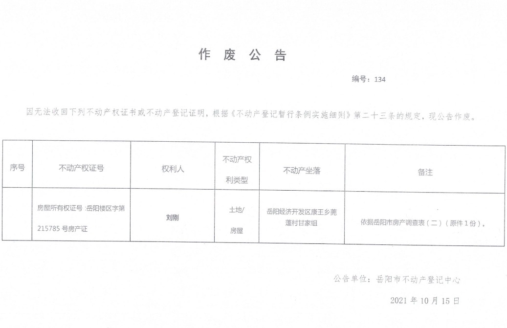 作废公告 编号134(刘刚)
