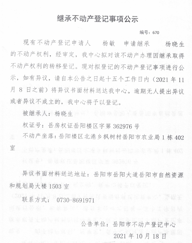 继承不动产登记公示 编号:(2021)继670号(杨敏)